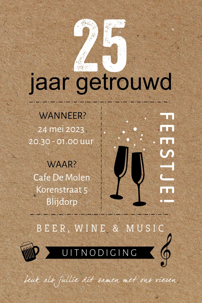 Uitnodigingskaart voor een 25-jarig huwelijksfeest. De kaart heeft een kartonnen achtergrond en de teksten worden in verschillende lettertypes op de kaart gezet.