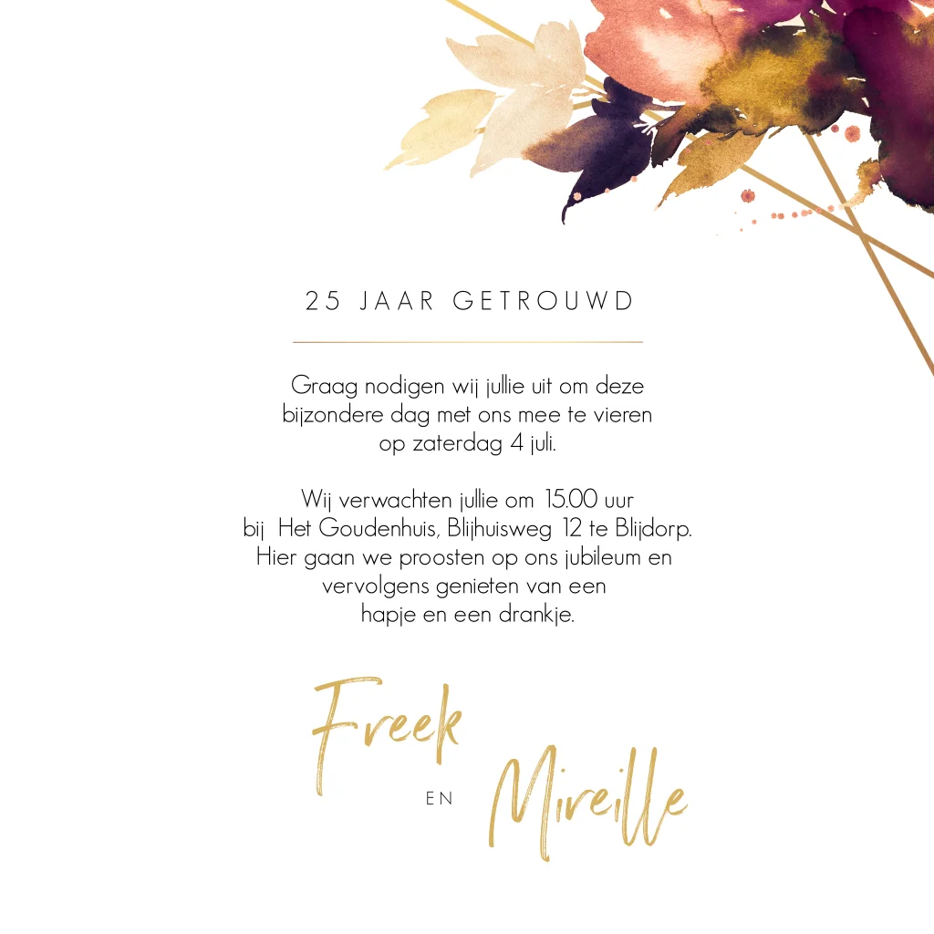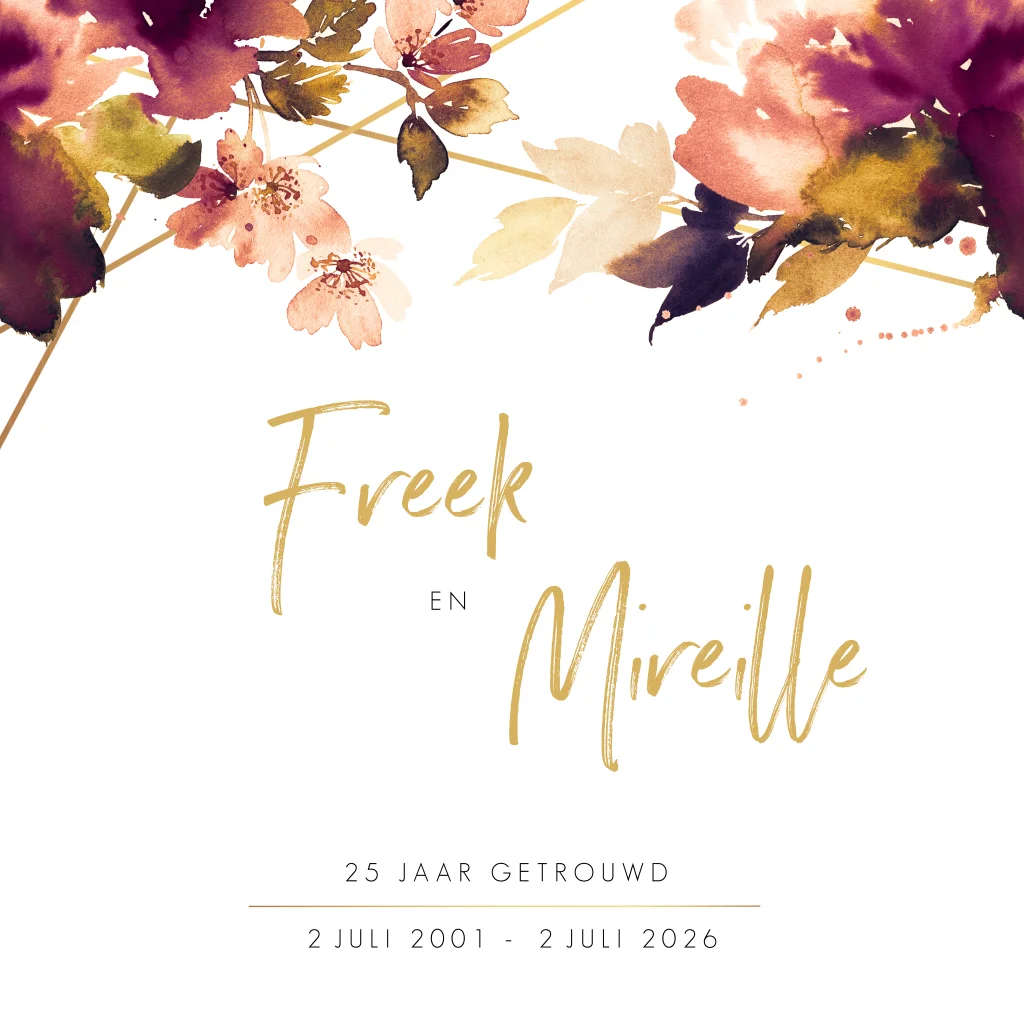 Romantische jubileumkaart met bloemen en goudtinten. De goudkleurige elementen in combinatie met de handgeschilderde bloemen van deze 25 jaar getrouwd kaart geven een chique uitstraling. De perfecte kaart voor een romantisch zilveren huwelijksjubileum. Kleuren en teksten zijn gemakkelijk aan te passen. Zo kun je deze kaart ook gebruiken voor andere bruiloftsjaren.