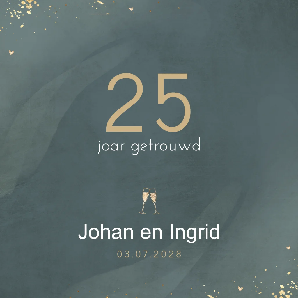 Uitnodigingskaart voor een 25-jarig huwelijksjubileum. Deze kaart heeft een rustige uitstraling. Het getal 25 staat duidelijk op de voorkant van de kaart. De namen van het echtpaar staan met sierlijke letters geschreven en het staat een lief klein hartje op de kaart.