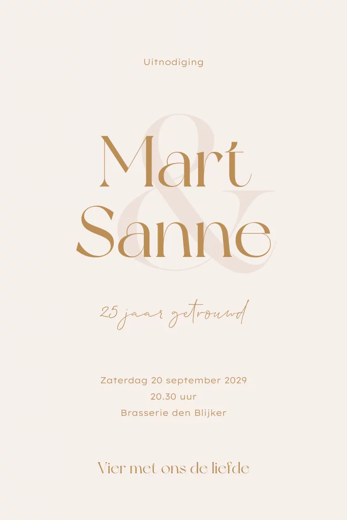 Eenvoudige basic uitnodiging voor 25 jaar getrouwd. Deze huwelijksjubileum uitnodiging heeft een beige kleurtint met verschillende lettertypes en een groot &-teken. Pas teksten en kleuren aan in onze online editor voor jullie persoonlijke touch. Maak deze kaart helemaal af met de bijpassende zandkleur envelop.