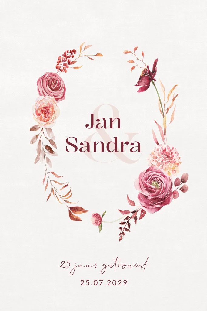 Een klassieke jubileumkaart met een kader vol geïllustreerde aquarel bloemen. In het kader zie je de naam van het bruidspaar staan met een & teken. De achtergrond is voorzien van een subtiele linnenlook. Pas deze jubileumkaart voor 25 jaar getrouwd naar eigen wens aan in onze online editor en maak er een unieke uitnodiging van.