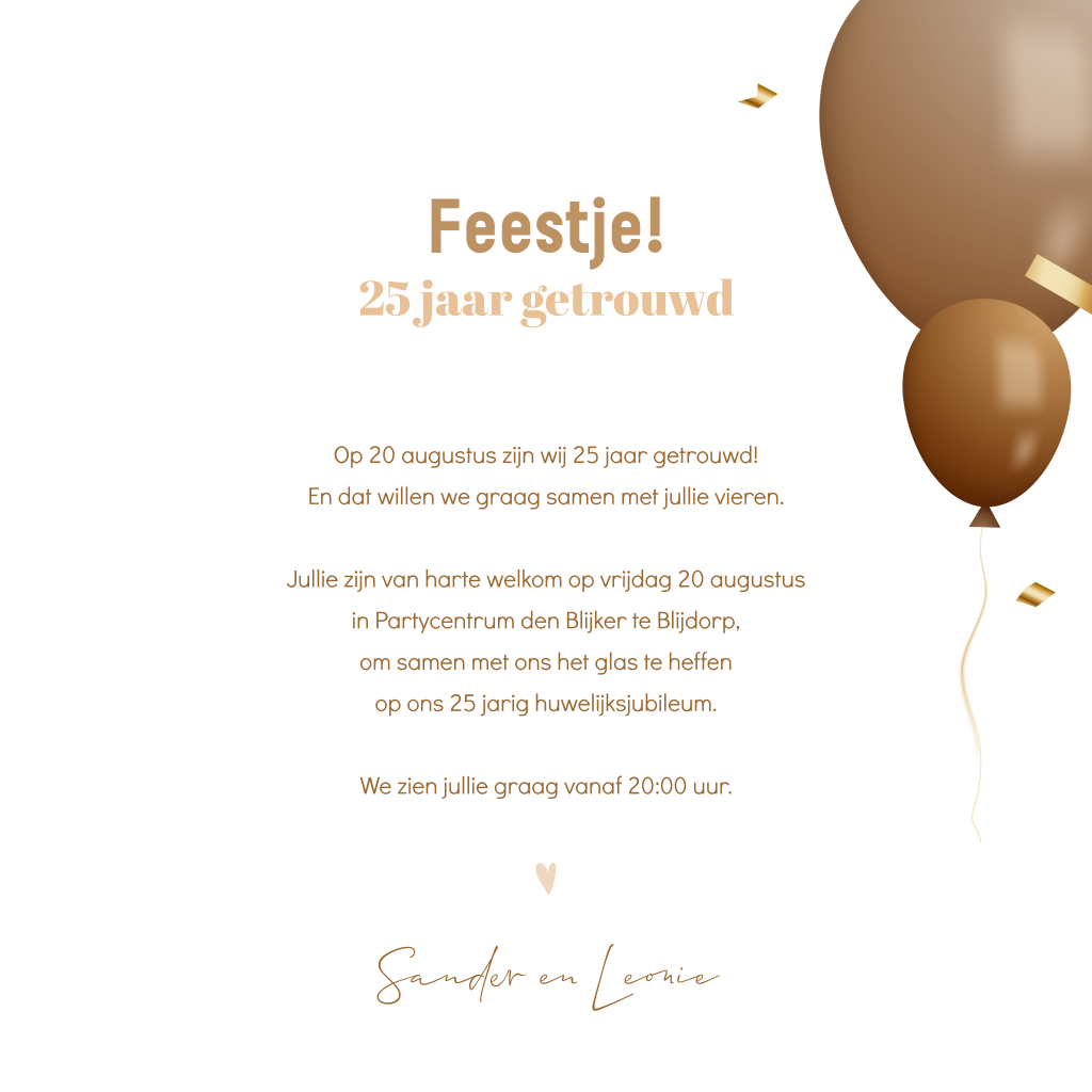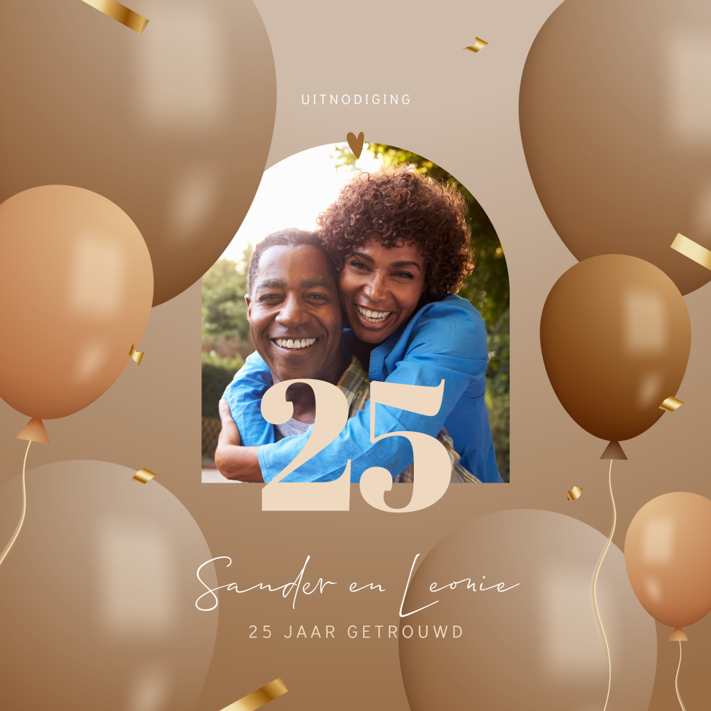 Wat een prachtige manier om je 25-jarig huwelijk te vieren! Deze uitnodiging is perfect voor een feestelijke gelegenheid. De jubileumkaart heeft een mooie bronskleurige achtergrond en is versierd met ballonnen en confetti. Er is ook ruimte voor een foto van jullie als stralend stel.