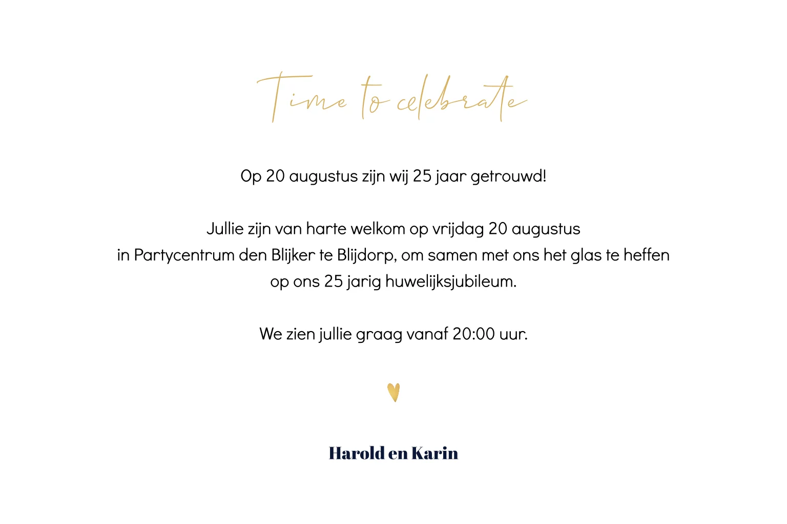 Deze uitnodigingskaart kun je naast een 25 jarig huwelijksjubileum ook gebruiken wanneer je wilt vieren dat je bijvoorbeeld 25 jaar samen bent of een werk gerelateerd jubileum feest wilt geven.