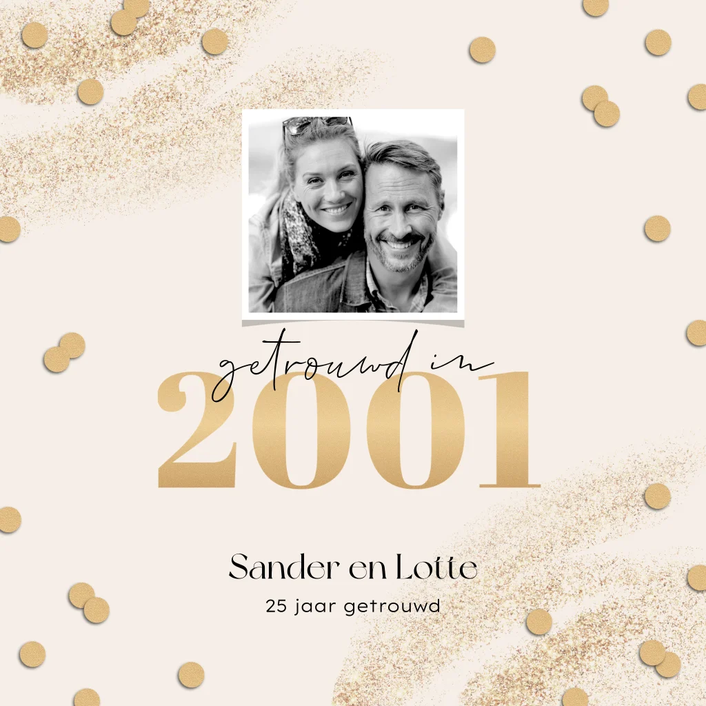 25 jaar getrouwd uitnodiging met goudlook, confetti en foto