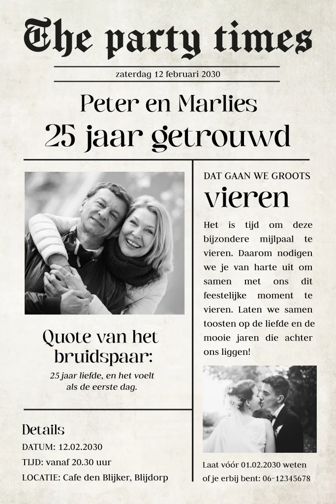 Hoe leuk is deze originele en aparte jubileumuitnodiging?! Kondig met deze uitnodiging in de stijl van een krant aan dat jullie 25 jaar getrouwd zijn. Voeg een foto van toen en nu toe om het nog persoonlijker te maken.