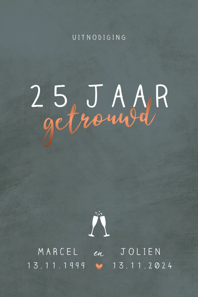 Stijlvolle uitnodigingskaart om jullie 25-jarig huwelijk te vieren. Deze jubileumkaart voor een zilveren huwelijksfeest heeft een ruwe donkergroene, betonlook achtergrond met tekst in wit en koperkleur. De proostende champagneglazen geven een feestelijk tintje. Liever andere kleuren of lettertypes? Dit is gemakkelijk aan te passen in de editor.