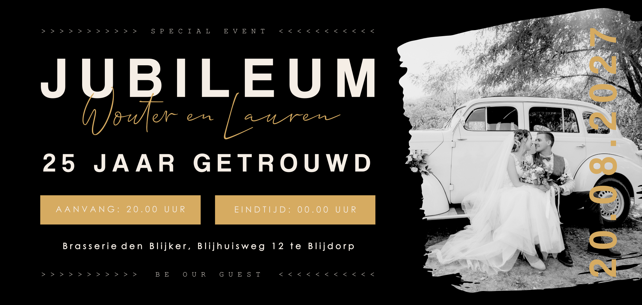 Deze uitnodigingskaart kun je naast een 25 jarig huwelijksjubileum ook gebruiken wanneer je wilt vieren dat je bijvoorbeeld 25 jaar samen bent of bijvoorbeeld een werk gerelateerd jubileum feest wilt geven. Zet dan een foto van bijvoorbeeld jullie bedrijf of team op de uitnodiging.