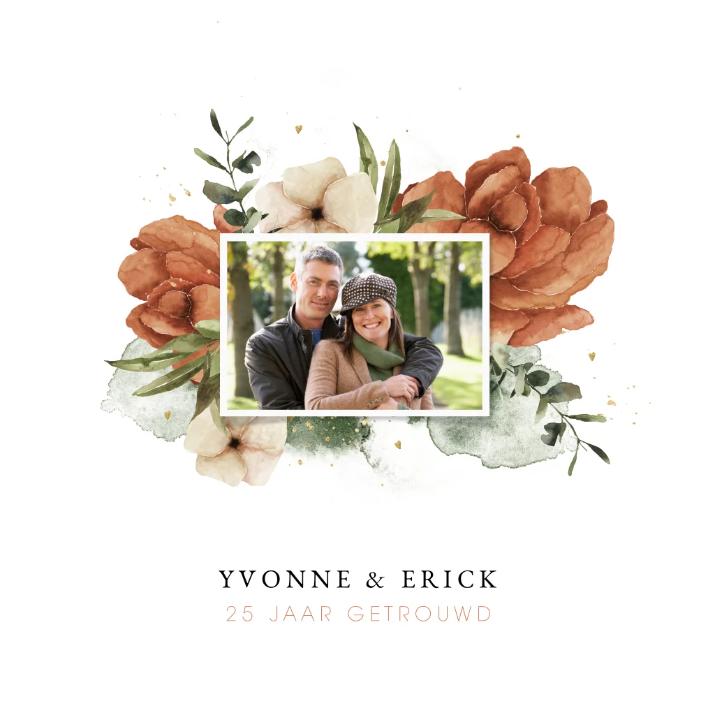 Jubileumuitnodiging 25 jaar getrouwd met aquarel bloemen en foto