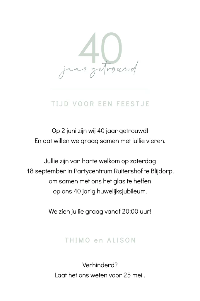Deze uitnodigingskaart kun je naast een 40-jarig huwelijksjubileum ook gebruiken wanneer je wilt vieren dat je bijvoorbeeld 12,5 jaar samen bent of een werk gerelateerd jubileum feest wilt geven.