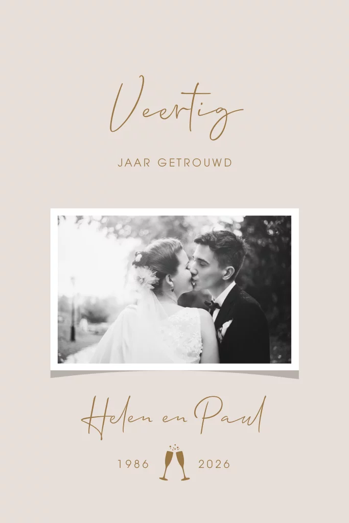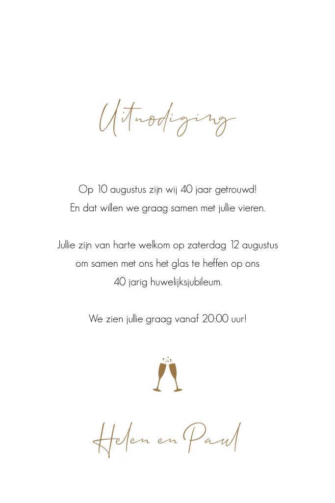 Uitnodigingskaart voor een 40-jarig huwelijksjubileum. Plaats op deze basic jubileumkaart, in rustige kleuren, een eigen foto. Misschien wel van jullie als het kersverse bruidspaar van veertig jaar geleden, óf als stralend stel wat inmiddels al veertig jaar getrouwd is. De kleine proostende champagneglazen geven een extra feestelijk tintje.