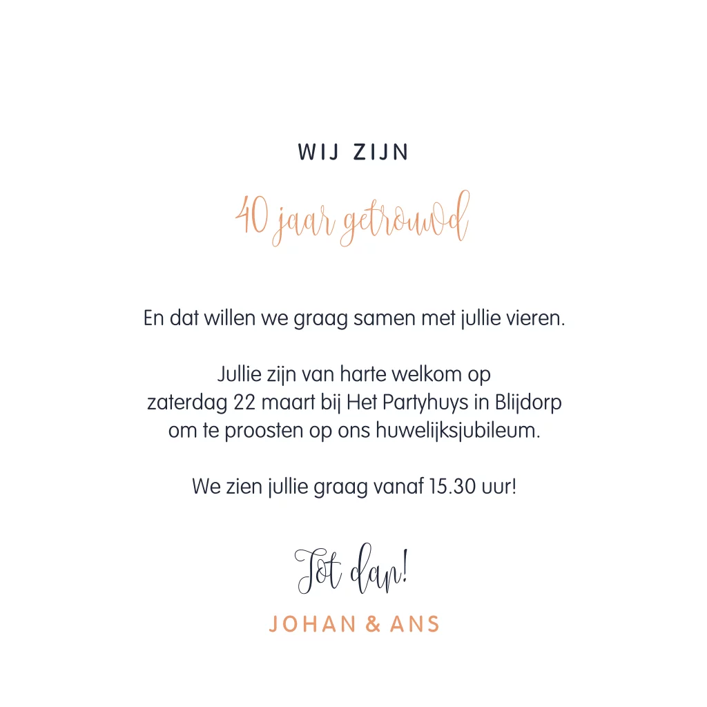 Moderne uitnodiging voor een 40 jaar huwelijks jubileum. Deze jubileumkaart heeft door de combinatie van wit met een koperen tint een stijlvolle look. De proostende champagne glazen maken de kaart extra feestelijk. Liever andere kleuren? Dit is gemakkelijk aan te passen.