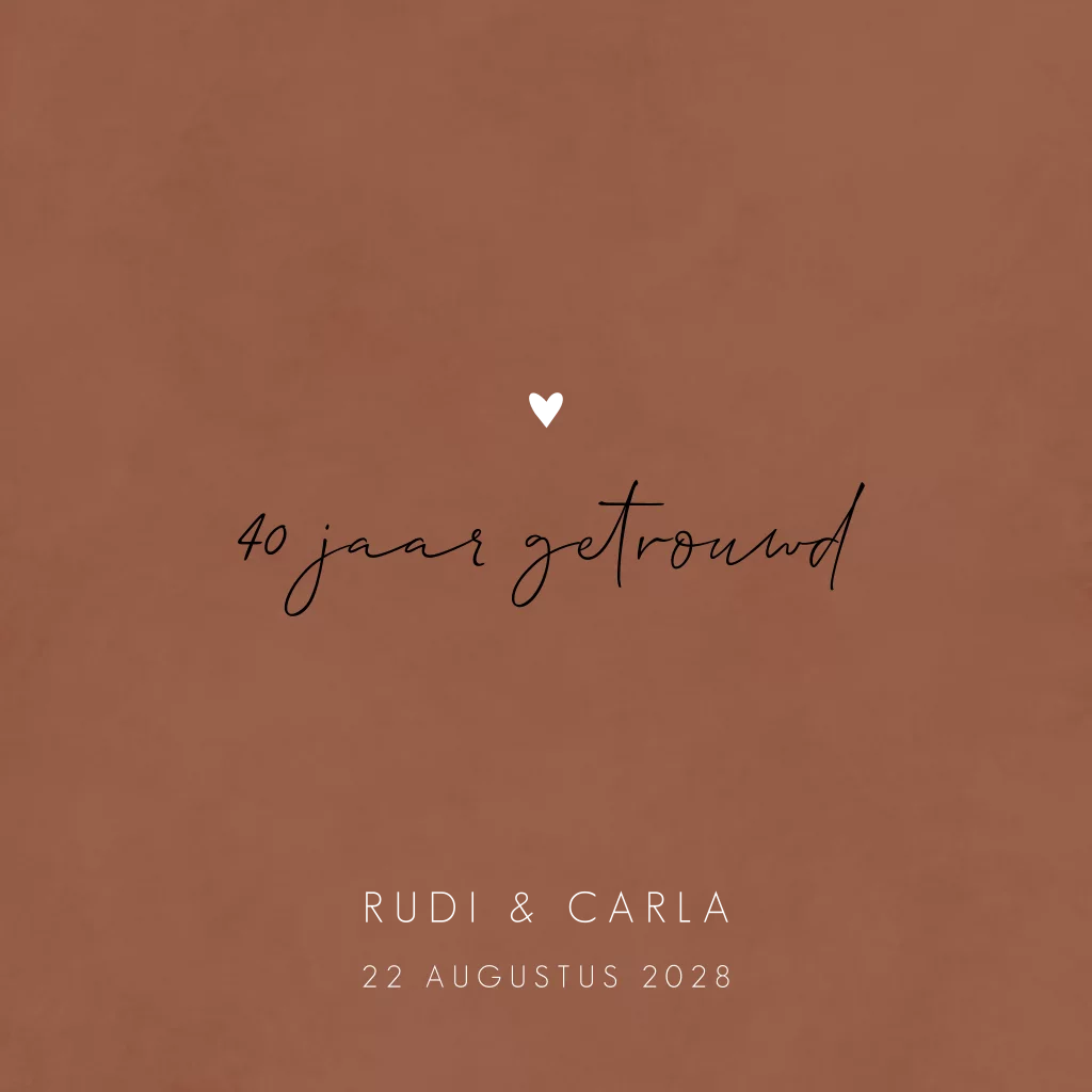 Stijlvolle jubileumkaart om te vieren dat jullie 40 jaar getrouwd zijn. Deze trouwkaart heeft een terracotta kleur met een eenvoudig design. De glanzende foliedruk geeft deze uitnodiging een luxe uitstraling. De kleuren pas je eenvoudig aan in onze editor. Hulp nodig bij het aanpassen? We staan voor je klaar!