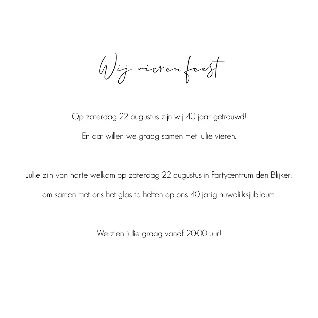 Deze uitnodigingskaart kun je naast een 40-jarig huwelijksjubileum ook gebruiken wanneer je wilt vieren dat je bijvoorbeeld 10 jaar samen bent of een werk gerelateerd jubileum feest wilt geven.
