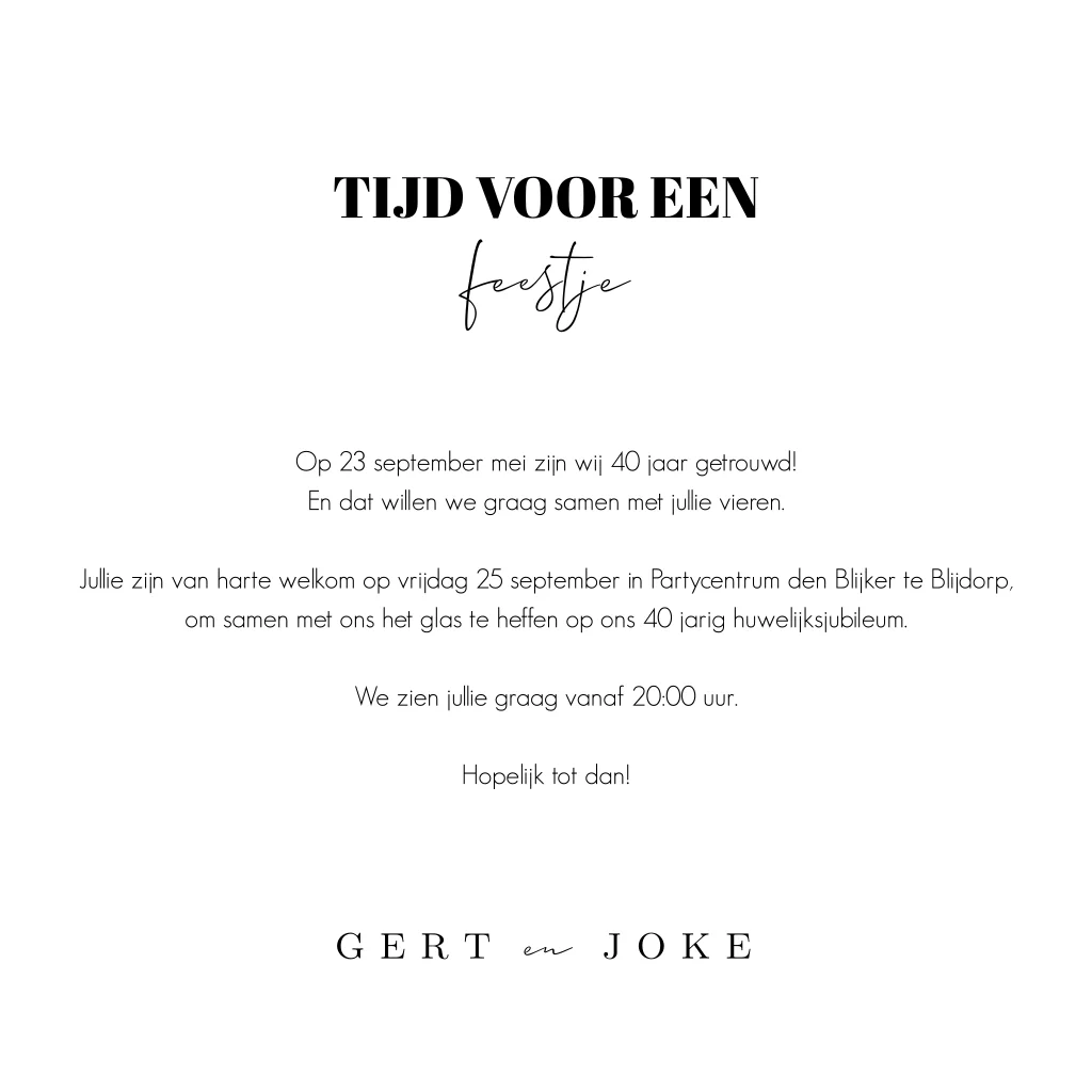 Deze uitnodigingskaart kun je naast een 40-jarig huwelijksjubileum ook gebruiken wanneer je wilt vieren dat je bijvoorbeeld 25 jaar samen bent of een werk gerelateerd jubileum feest wilt geven.