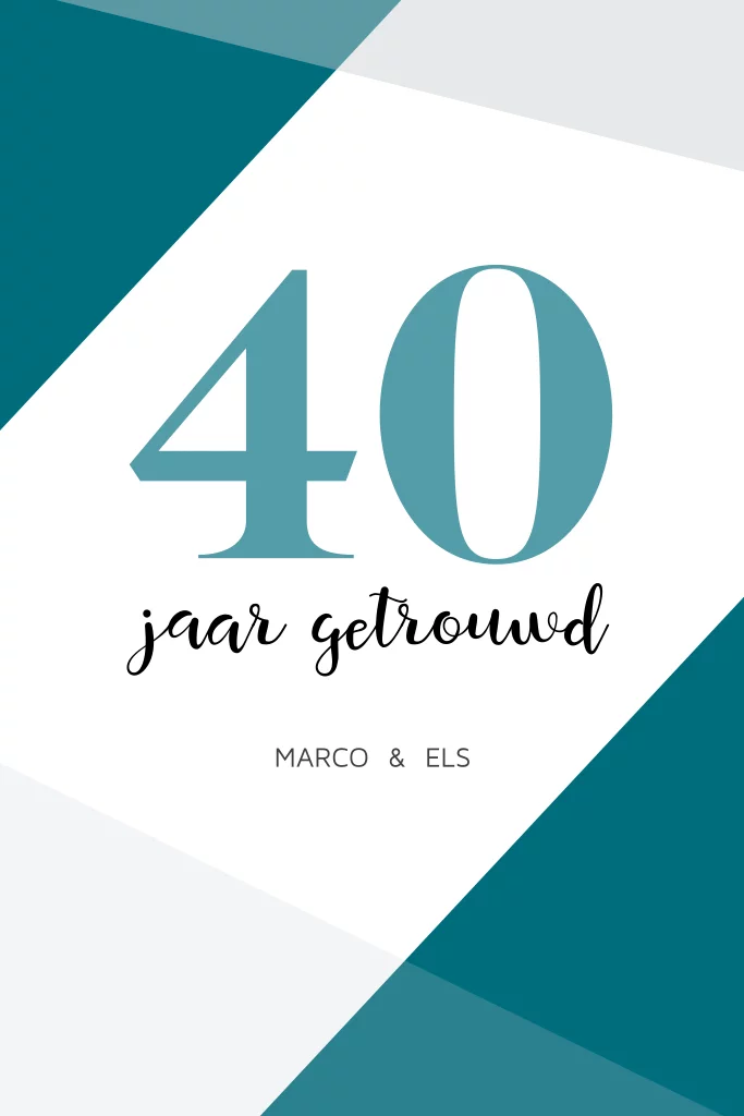 Moderne 40 jaar getrouwd uitnodigingskaart met hippe vlak verdeling. Het cijfer 40 staat groot op de kaart en heeft een hippe kleur. De sierlijke letters breken de strakke uitstraling. Deze kaart is eenvoudig aan te passen.