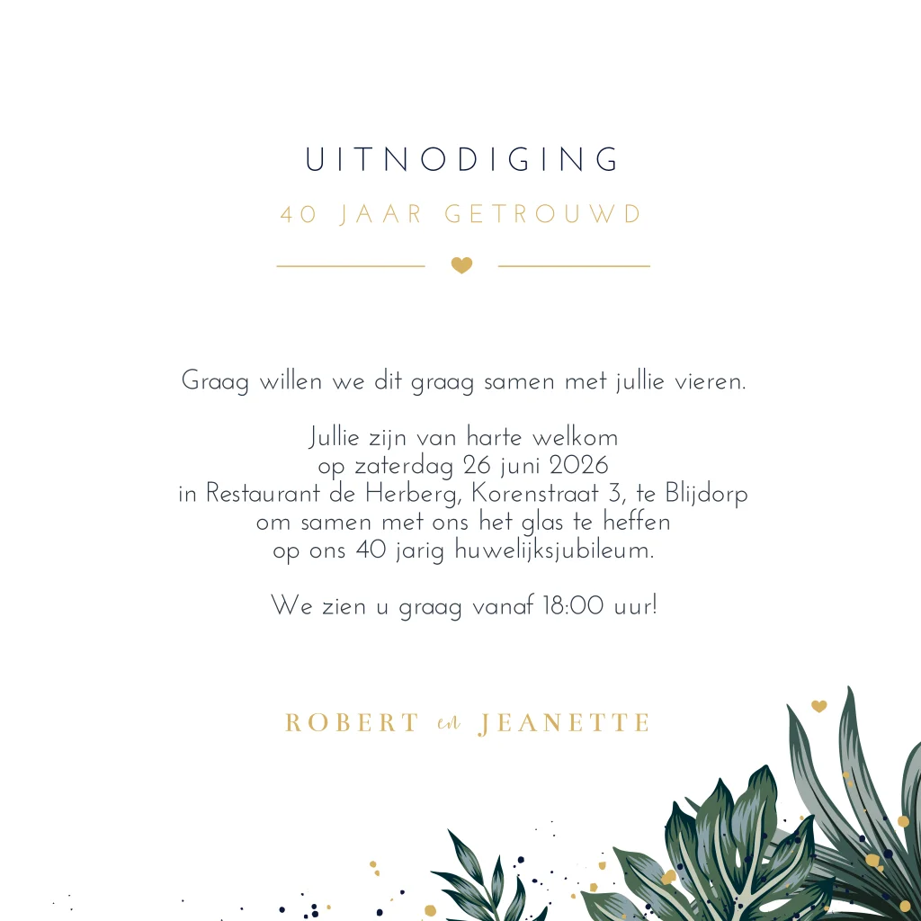 Deze jubileumkaart voor 40 jaar getrouwd is stijlvol met mooie botanische bladeren. Deze uitnodiging heeft een warme donkerblauwe achtergrond met tekst in wit en goudkleur, een mooie combinatie. De namen staan in een strak lettertype geschreven. Deze 40 jaar getrouwd kaart past perfect bij een robijnen huwelijk en is gemakkelijk aan te passen.