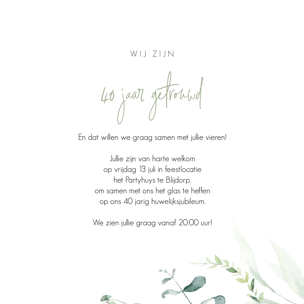 Rustige en sierlijk 40 jaar getrouwd uitnodiging met sierlijke bloemen. De bloemen in groen en wit tinten vormen een mooie rand aan de bovenkant. Deze jubileumkaart is tijdloos en chique.