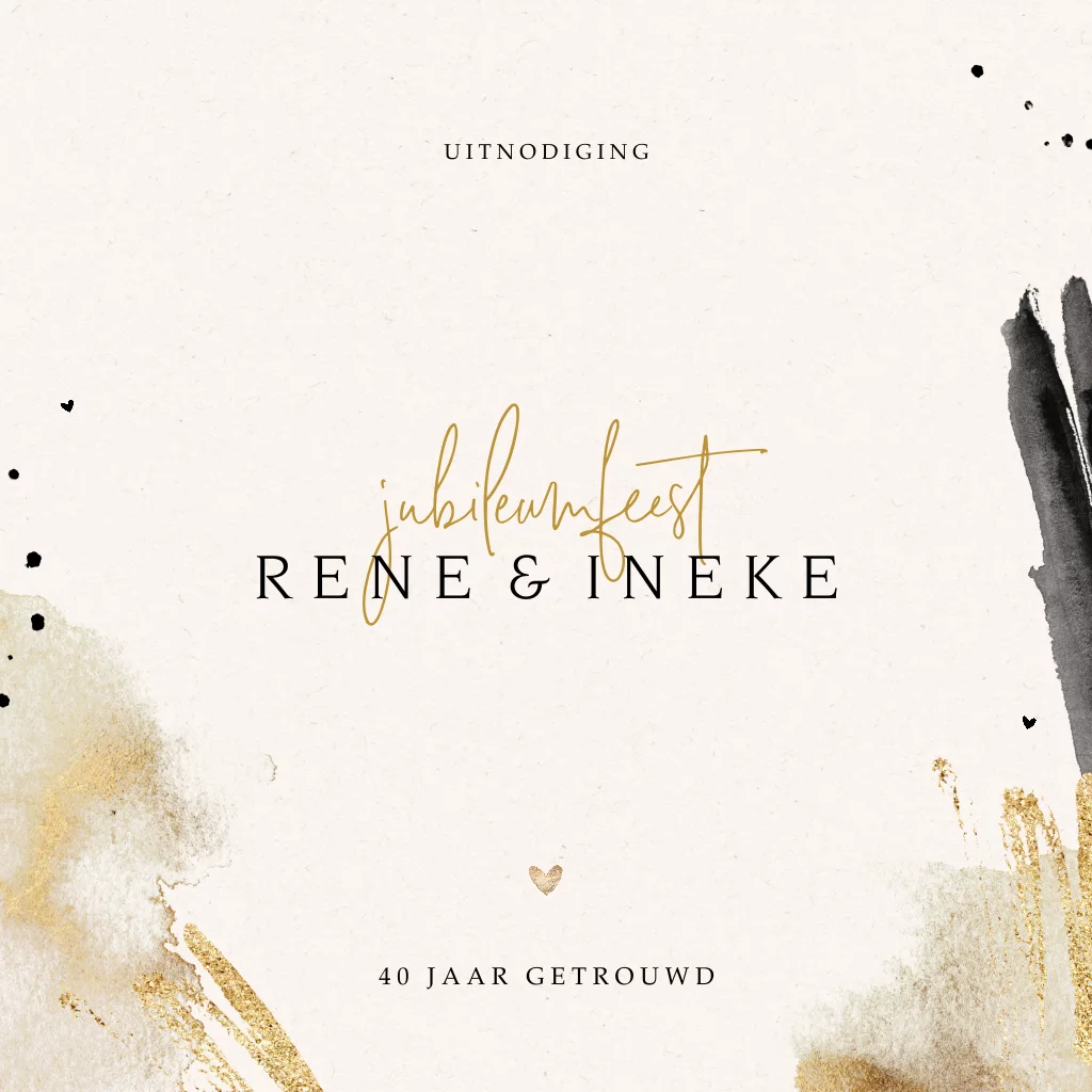 Moderne jubileumkaart voor een 40-jarig huwelijk met een karton look achtergrond en mooie aquarel vegen. De goudtinten geven deze uitnodiging een chique tintje. Deze kaart voor 40 jaar getrouwd is ook geschikt voor andere bruiloftsjaren. Pas de teksten en lettertypes naar je eigen wensen aan in de editor.