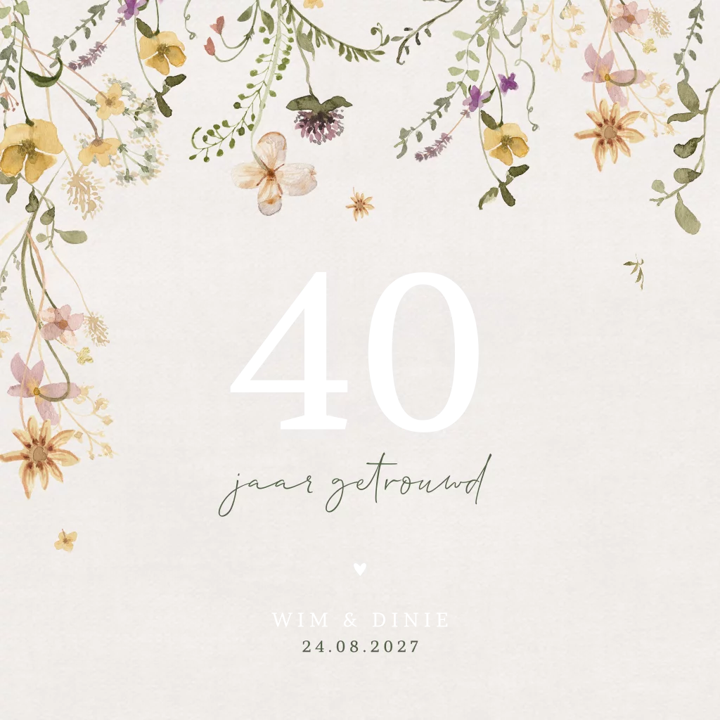 Klassieke trouwkaart met prachtige aquarel bloemen en een lichte linnen achtergrond. Het jubileum 40 en de namen van het jubileumpaar worden gedrukt in écht goudfolie. De folie heeft een mooie glans en geeft deze kaart een extra luxe uitstraling. Pas de (folie)kleuren, teksten en lettertypen gemakkelijk aan in de editor. Hulp nodig? Bel, mail of chat ons gerust.