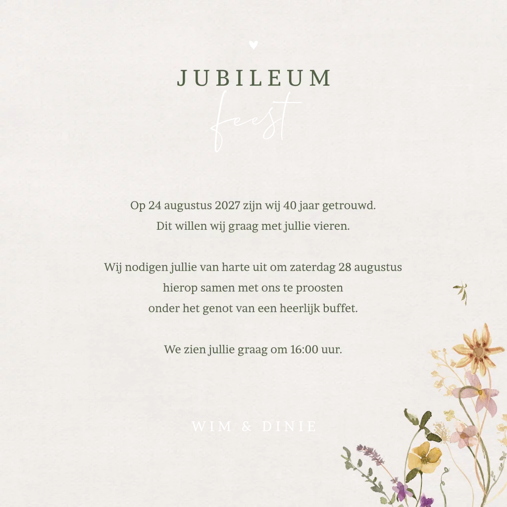Deze uitnodigingskaart kun je naast een 40-jarig huwelijksjubileum ook gebruiken wanneer je wilt vieren dat je bijvoorbeeld 12,5 jaar samen bent of een werk gerelateerd jubileum feest wilt geven.
