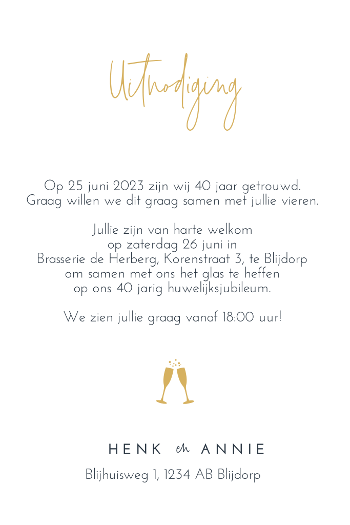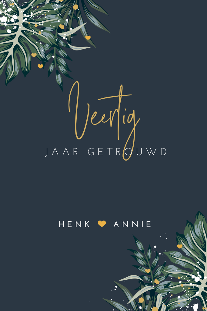 Deze jubileumkaart voor 40 jaar getrouwd is stijlvol en heeft mooie botanische bladeren in de hoeken. Deze uitnodiging heeft een warme donkerblauwe achtergrond met tekst in wit en goudkleur, een mooie combinatie. De kleine goudkleurige hartjes en witte spetters maken de kaart af. Deze 40 jaar getrouwd kaart past goed bij een robijnen huwelijk en is gemakkelijk aan te passen in onze editor.