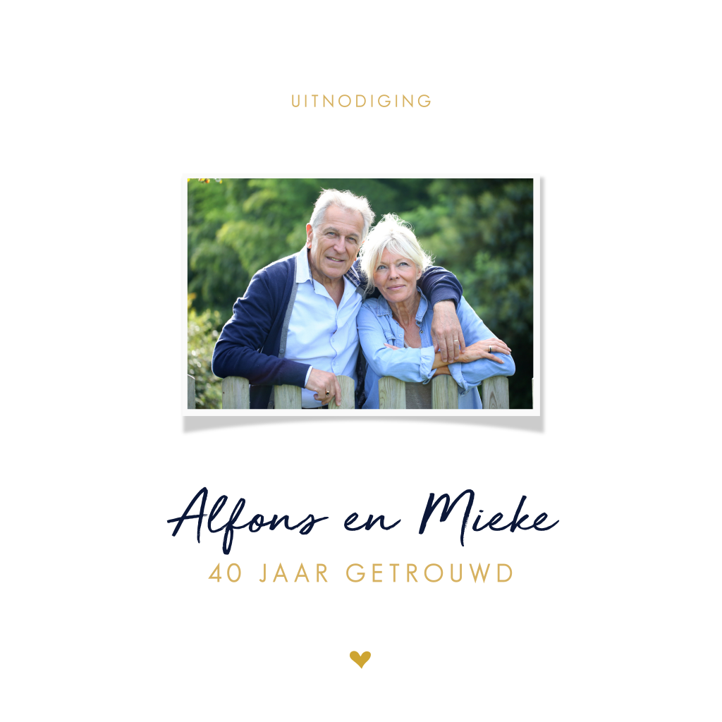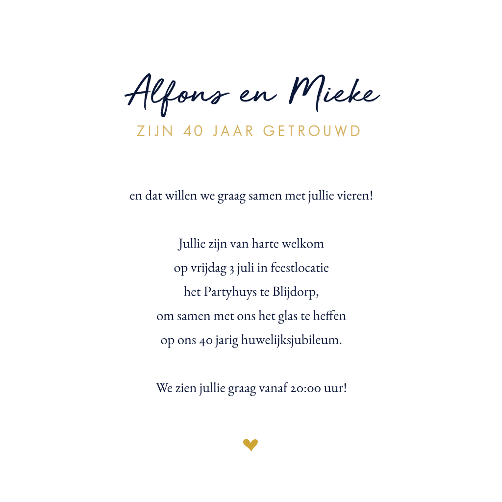 Stijlvolle foto uitnodiging voor 40 jaar getrouwd op een donkerblauwe achtergrond. De kleurencombinatie donkerblauw met goud tint en de sierlijke letters maken de kaart heel chique.