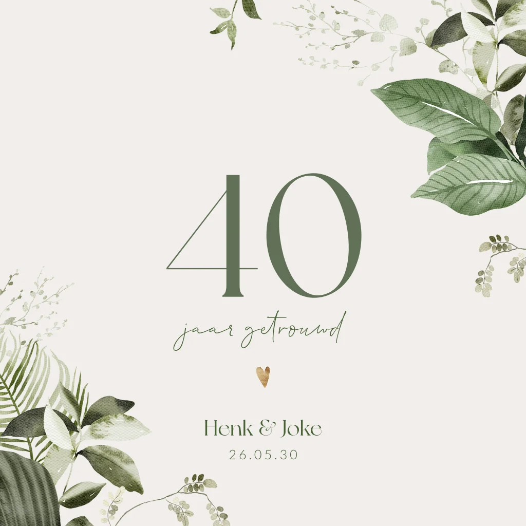 Deze jubileumkaart heeft een beige achtergrond met groene botanische bladeren. Het gouden hartje geeft een romantische touch. Op de kaart staat in het groot 40 jaar getrouwd. Pas de kaart geheel naar eigen wens aan in de editor, zodat het precies bij jullie bruiloft past. Vragen? Laat het ons weten!