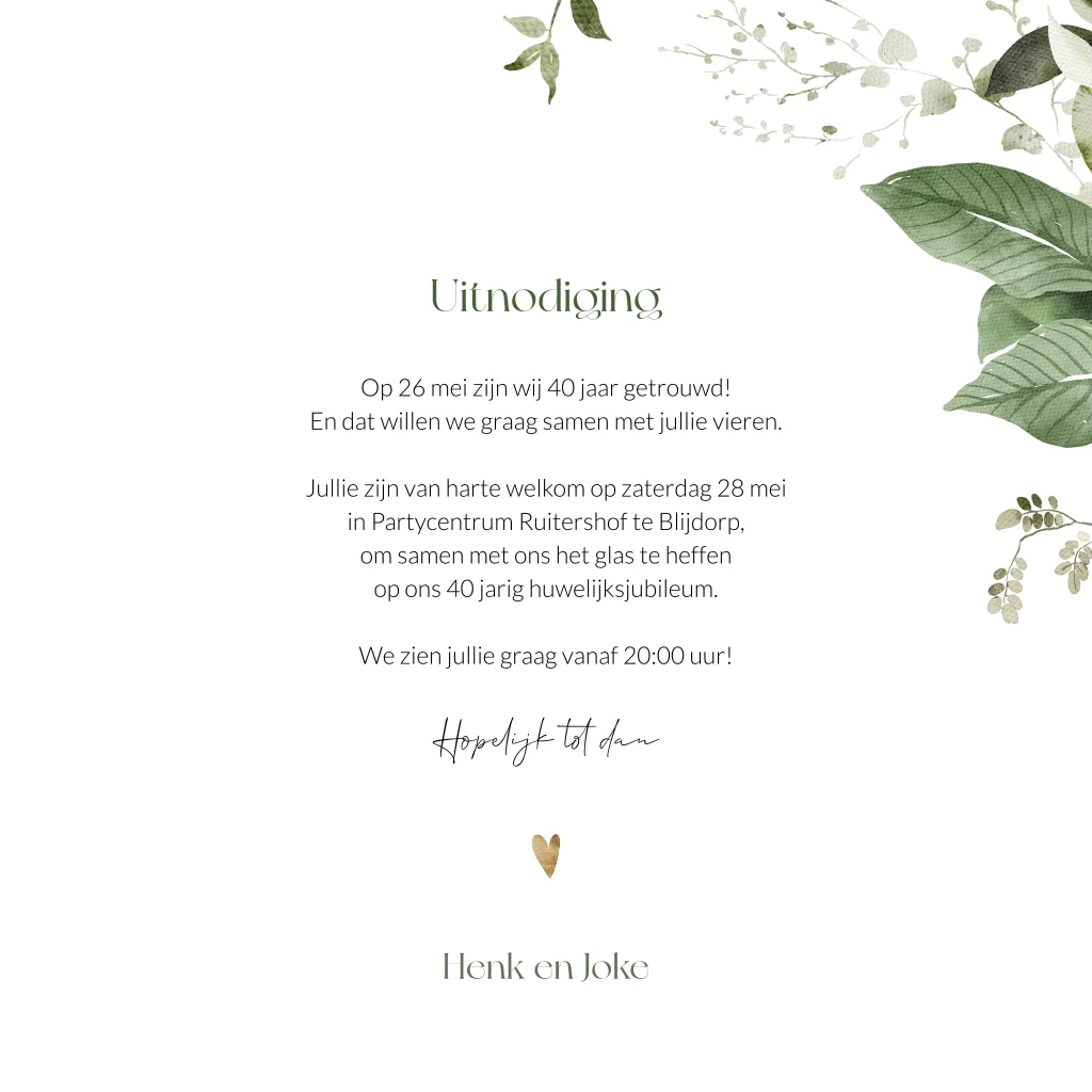Uitnodiging 40 jaar getrouwd met botanische bladeren en goudlook hart