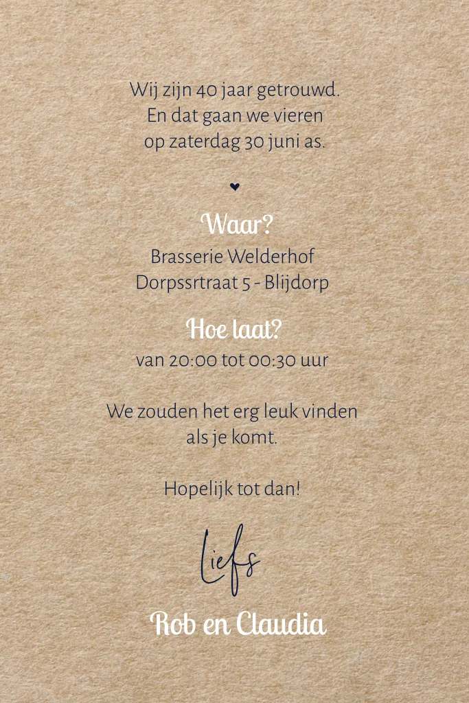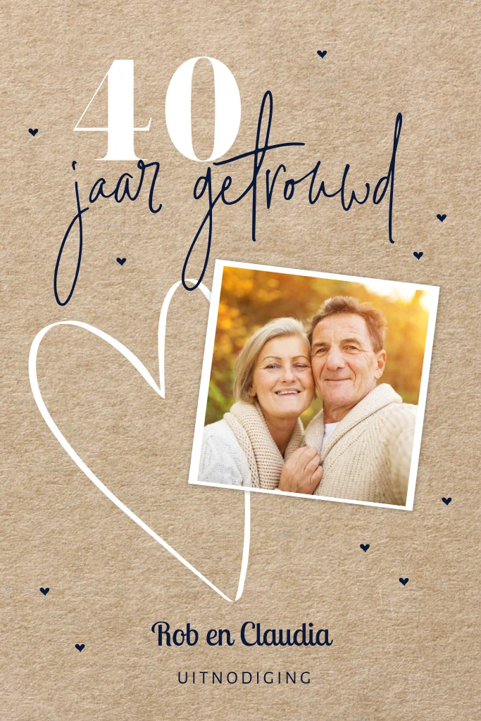 Hippe uitnodiging met foto voor jullie 40-jarig huwelijk. Op deze kaart staat jullie eigen foto omringd door lieve hartjes.
