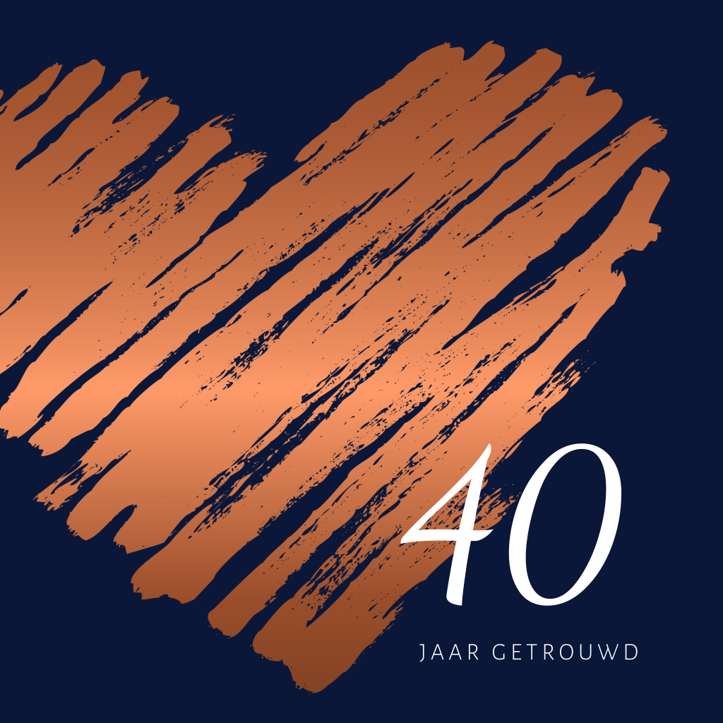 Hippe jubileumkaart voor 40 jaar getrouwd. Het grote koperkleurige hart geeft de kaart een chique uitstraling. Deze kaart is tijdloos en het aantal huwelijksjaren is gemakkelijk aan te passen. Het gekraste hart op donkerblauw is een echte sierlijk chique combinatie.