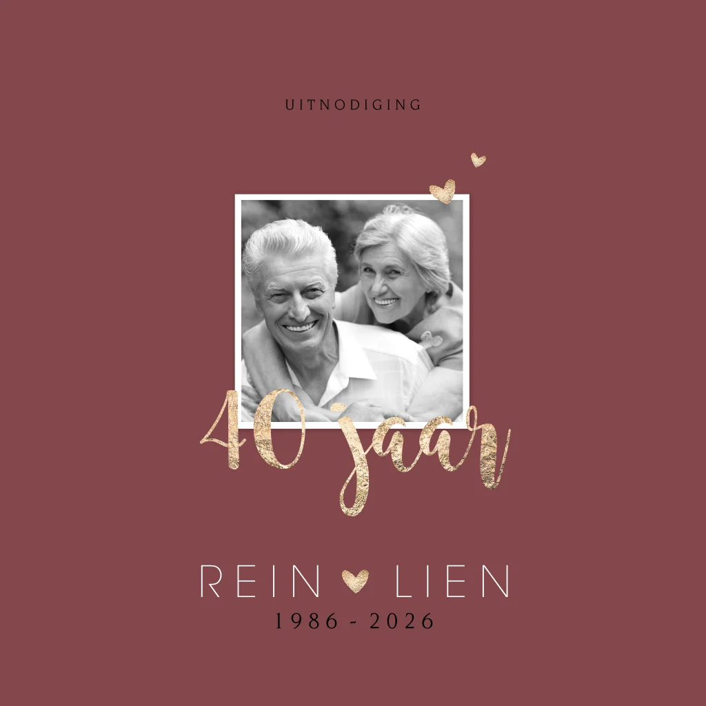 Uitnodiging voor een 40-jarig huwelijks jubileum in een warme kleur pruimenrood met ruimte voor een eigen foto. Onder de foto staat de tekst '40 jaar' in sierlijke letters en een mooie goudlook. De combinatie van de roodachtige en paarse kleur met de goudtinten geven deze kaart een chique uitstraling. Pas deze jubileumkaart naar je eigen smaak aan in de editor en combineer met een mooie envelop om het helemaal af te maken.
