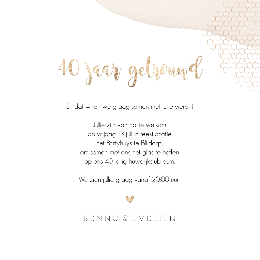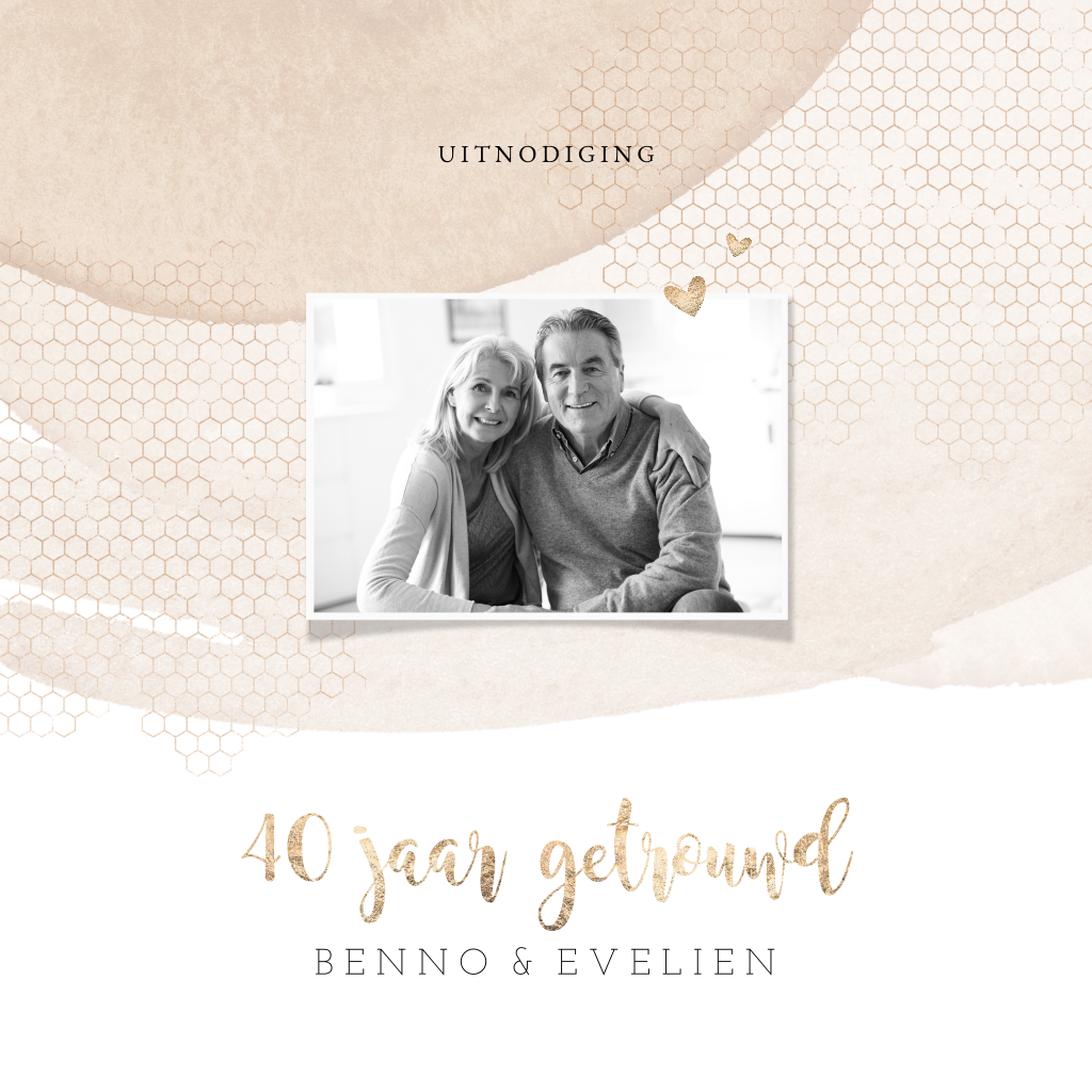 Hippe uitnodiging voor 40 jaar getrouwd jubileum met eigen foto. Veertig staat voluit geschreven en staat samen met de eigen foto van het echtpaar centraal op deze kaart. De zacht blauwe kleur is gemakkelijk aan te passen. De gouden hartjes maken deze jubileumkaart helemaal af. Deze 40 jaar getrouwd uitnodigingskaart kaart is sierlijk en hip.