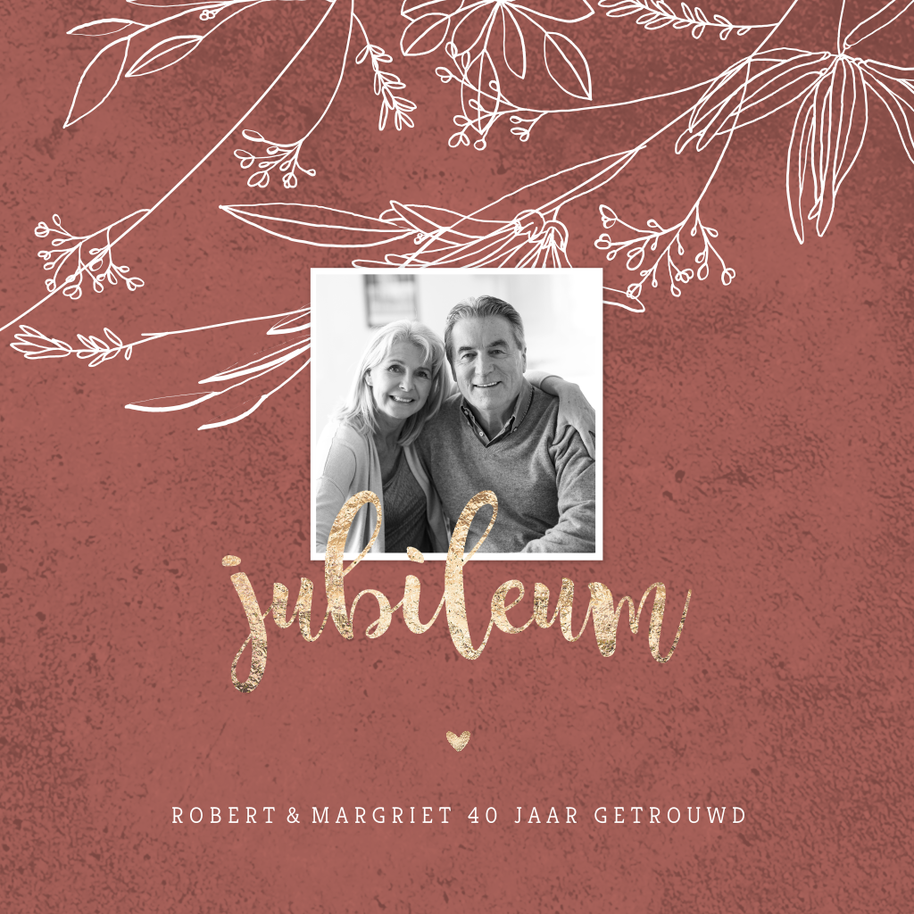 Stijlvolle uitnodiging voor jullie huwelijksjubileum. Op de voorkant van de kaart staat een mooi kader met bloemen. De bloemen komen aan de binnenkant weer terug. De kaart maak je extra persoonlijk door het plaatsen van jullie eigen foto