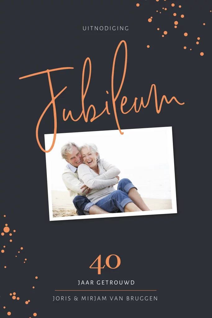 Stijlvolle uitnodiging voor een 40-jarig huwelijksjubileum. Voeg een eigen persoonlijke foto toe. Het woord jubileum is geschreven in een mooi sierlijke lettertype.