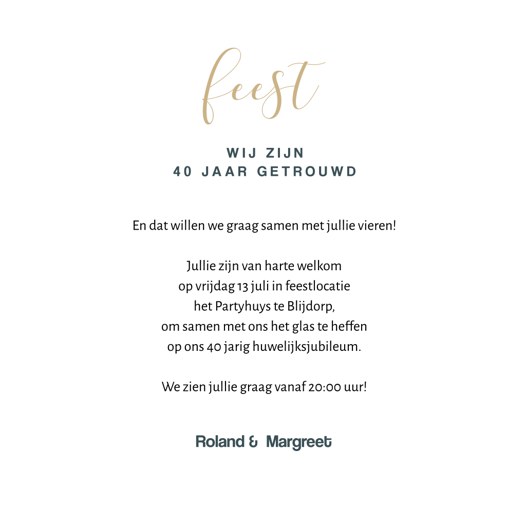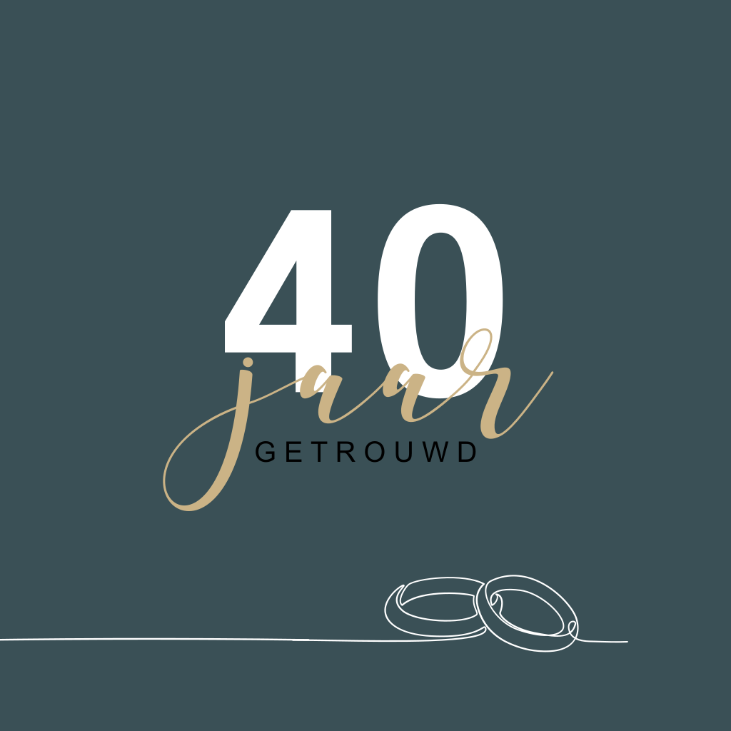 Trendy uitnodiging voor 40 jaar getrouwd. Het grote cijfer 40 staat centraal op deze kaart. De blauwe kleur is gemakkelijk aan te passen. De twee ringen die in elkaar overlopen benadrukken het huwelijksjubileum. Deze jubileumkaart is tijdloos en trendy.