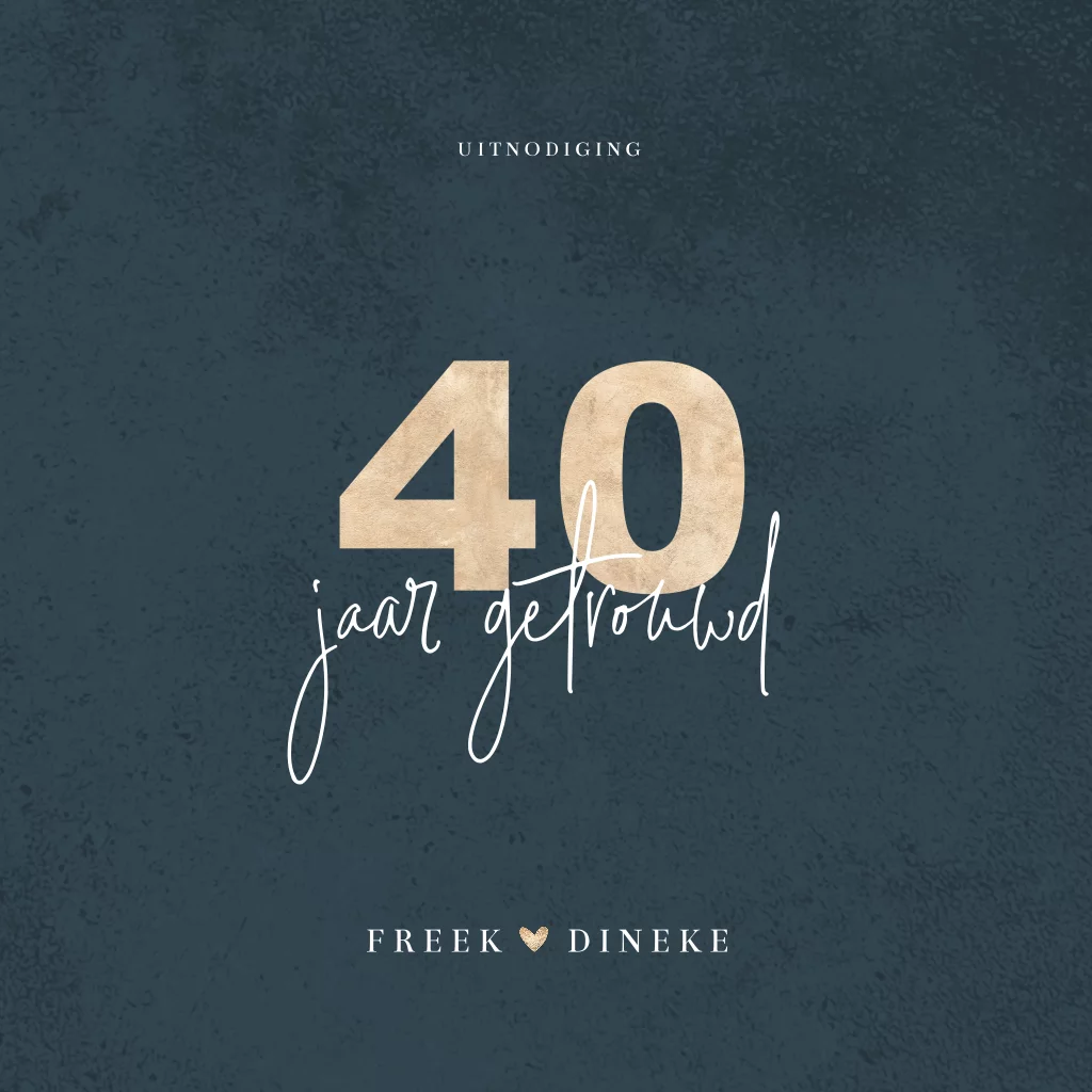 Stijlvolle jubileumkaart voor veertig jaar getrouwd. Deze uitnodiging heeft een donkerblauwe betonlook achtergrond gecombineerd met het getal 40 in goudlook en witte tekst. De kleine goudkleurige hartjes en spetters maken het kaartje af. Kleuren en lettertypes zijn aan te passen in de editor.