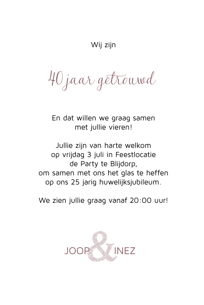 Mooi sierlijke 40 jaar getrouwd uitnodiging met label. Doordat deze mooie kaart voornamelijk wit is, straalt deze rust uit. De hartjes maken de kaart helemaal af.