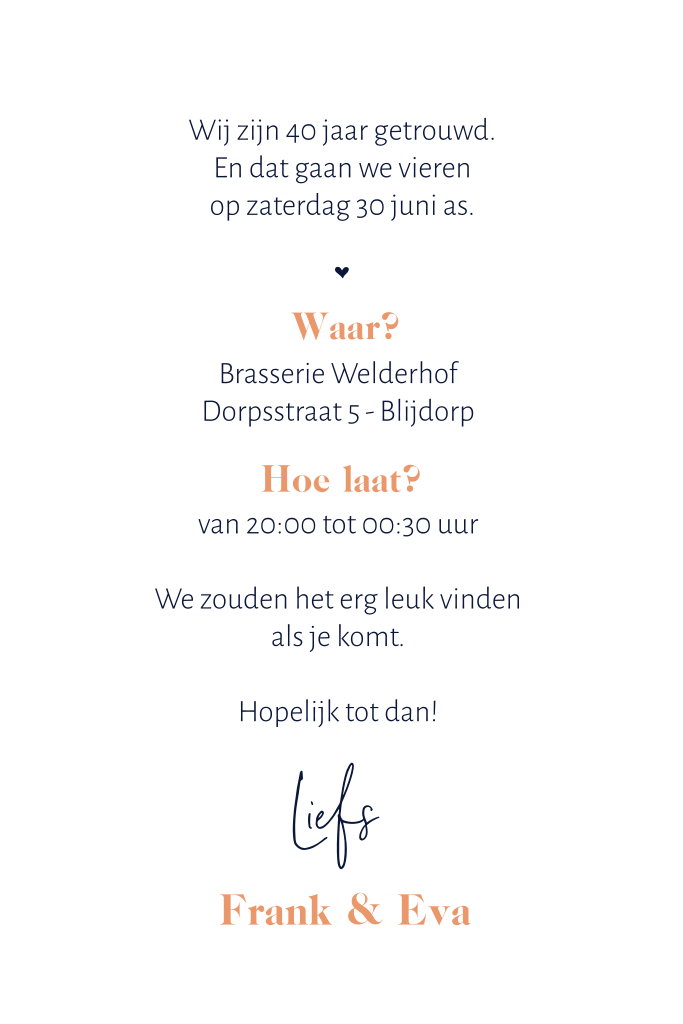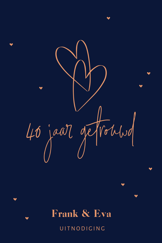 Mooie uitnodiging voor jullie 40-jarig huwelijk. Op deze mooie kaart twee harten door elkaar heen en omringt met allemaal kleine hartjes. De sierlijke letters en de combinatie van donkerblauw met rose, geven de kaart een chique tintje.
