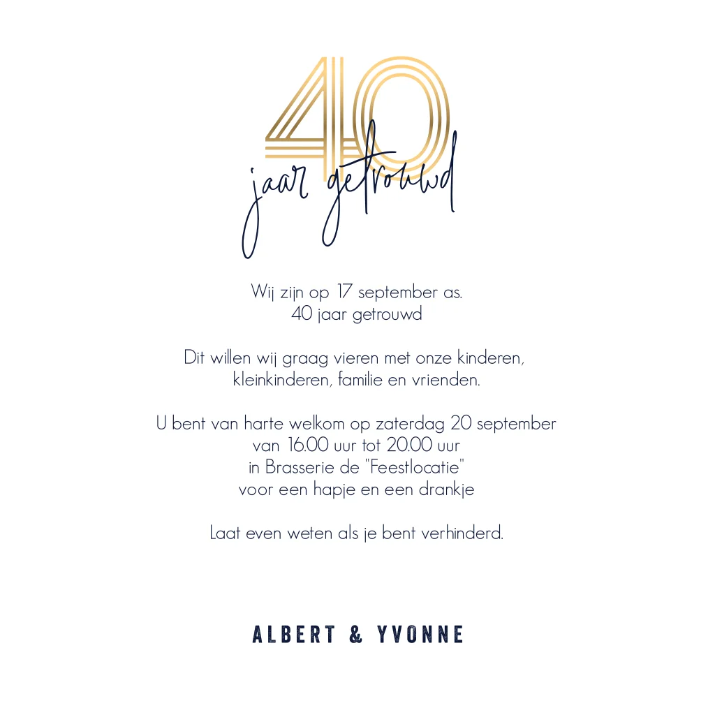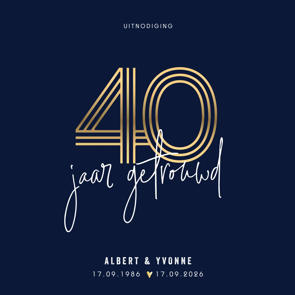 Prachtige uitnodiging voor een 40-jarig huwelijk. Het getal 40 komt extra mooi uit met een verloop in de goudkleur op een donkerblauwe achtergrond.
