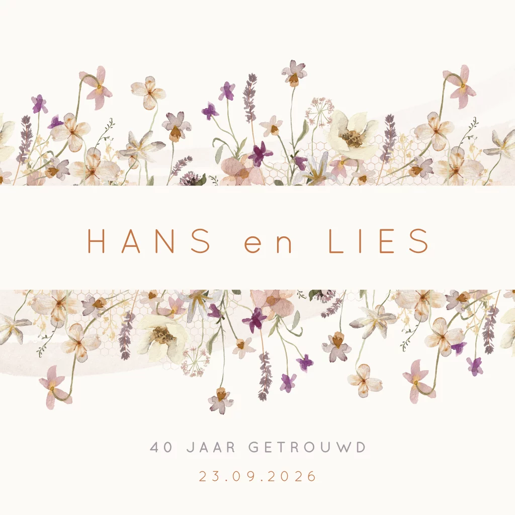 Prachtige jubileumkaart met aquarel veldbloemen. Jullie namen staan in een langwerpig kader met daaromheen bloemen in zachte kleuren. Deze floral uitnodiging is geschikt voor als je 40 jaar getrouwd bent maar kun je gemakkelijk aanpassen naar andere jubileumjaren. De teksten kun je in de ontwerpmodule aanpassen. Vragen? Laat het ons weten!