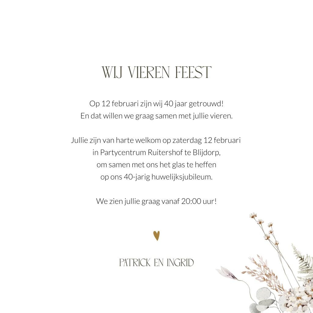 Vier jullie 40-jarig huwelijksjubileum in stijl met deze prachtige uitnodiging met bloemen rondom een frame met hartje. Deze uitnodiging heeft een romantische en stijlvolle uitstraling. Bestel vandaag nog en maak van dit bijzondere jubileum een onvergetelijke gebeurtenis!