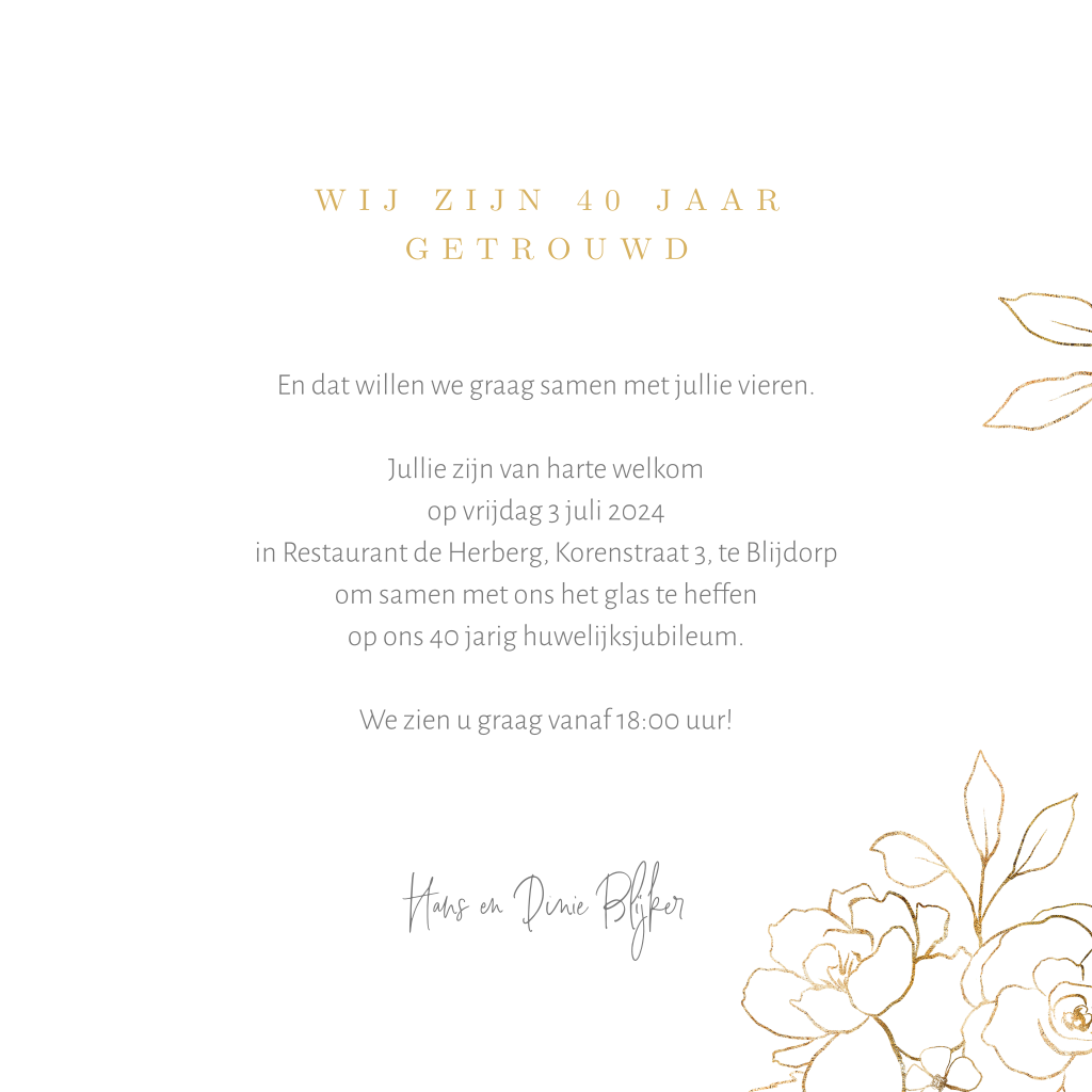 Jubileumkaart voor 40 jaar getrouwd. Op deze uitnodiging staan sierlijke bloemen in goudkleur. Deze kaart is verder overwegend wit en heeft een rustige en romantische uitstraling. Pas de kaart naar wens aan in onze editor.