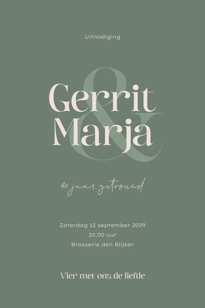 Een stijlvolle basic 40 jaar getrouwd uitnodiging! Deze 40 jarig jubileumkaart is in groene kleurtinten vormgegeven met verschillende lettertypes en een groot &-teken. Pas teksten en kleuren aan in onze online editor voor jullie persoonlijke touch. Maak deze 40 jaar samen uitnodiging helemaal af met de bijpassende metallic beige envelopkleur.