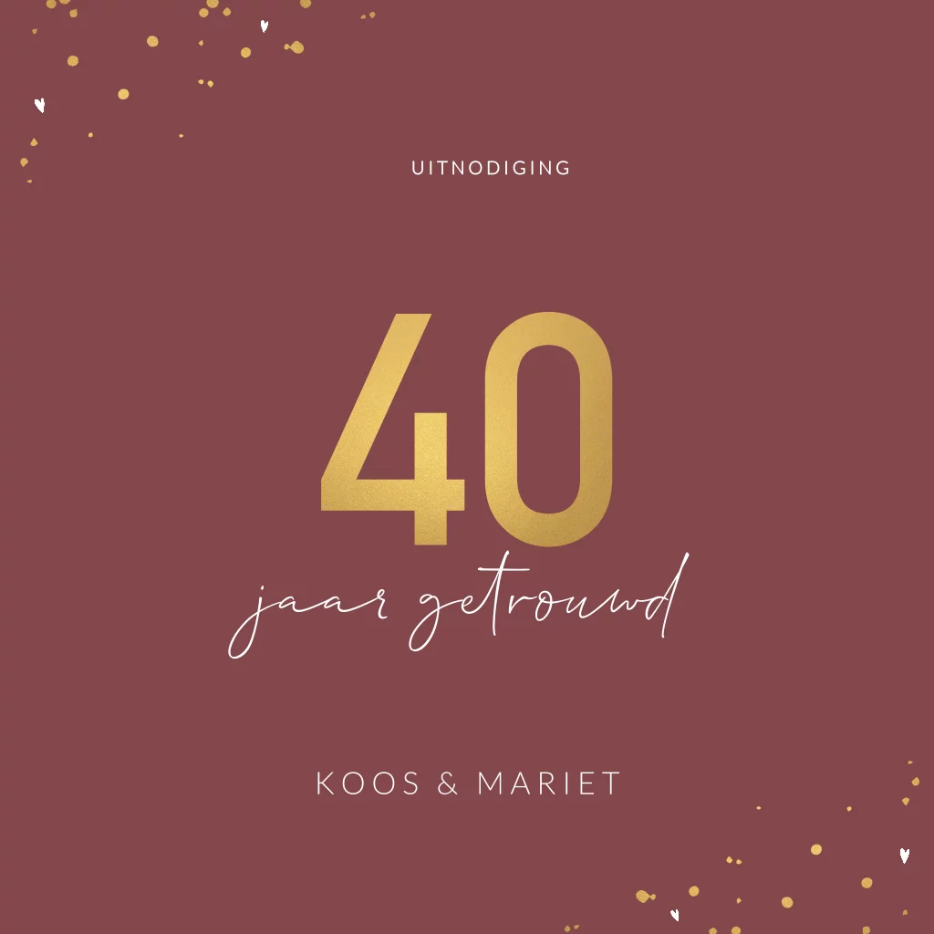 Nodig jullie dierbaren uit met deze jubileumkaart voor 40 jaar getrouwd in de warme kleur pruimenrood. Op deze chique kaart staat in goudlook het getal 40 centraal: speciaal voor jullie als robijnen echtpaar. Proostende champagne glazen en kleine hartjes geven de kaart een feestelijke en liefdevolle uitstraling. Je kunt deze jubileumkaart zelf bewerken in de editor en naar je eigen smaak aanpassen.