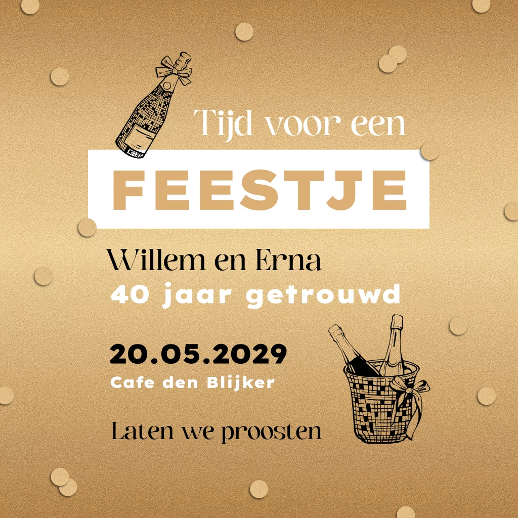 Feestelijke jubileumkaart om te vieren dat jullie 40 jaar getrouwd zijn. Deze huwelijksjubileum uitnodiging heeft een goudlook met gouden confetti en champagne met de toepasselijke tekst 'Tijd voor een feestje'. De combinatie van de goudenlook en de antiek gouden envelop zorgen voor een chique uitstraling.