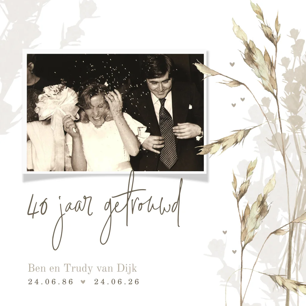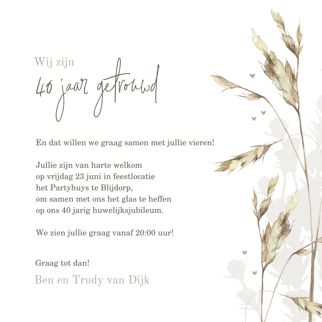 Mooie jubileumkaart voor 40 jaar getrouwd met droogbloemen. Op deze uitnodigingskaart voeg je een eigen foto toe. Deze kaart is ook geschikt voor andere bruiloftsjaren. Teksten en kleuren zijn gemakkelijk aan te passen in de editor.