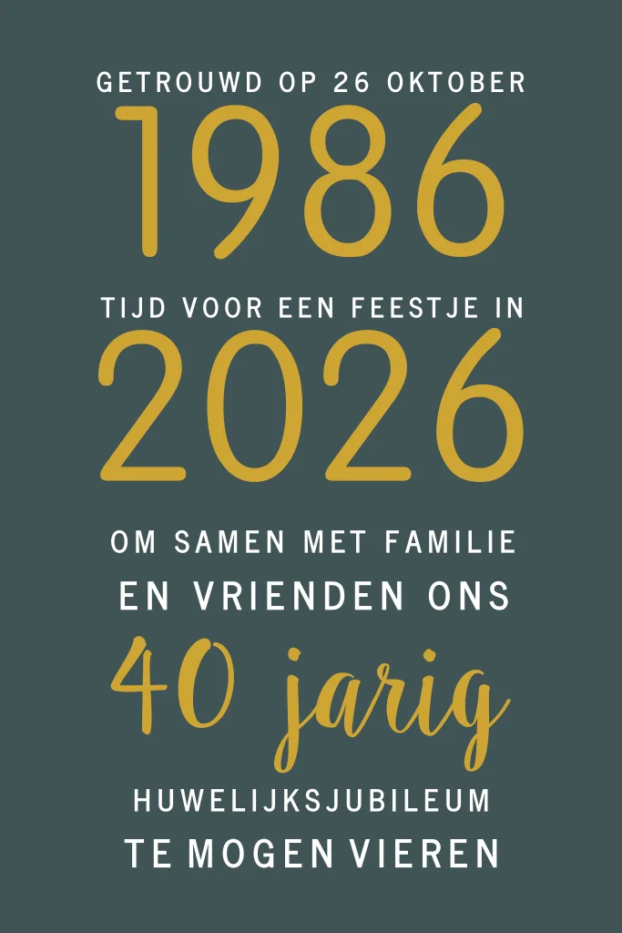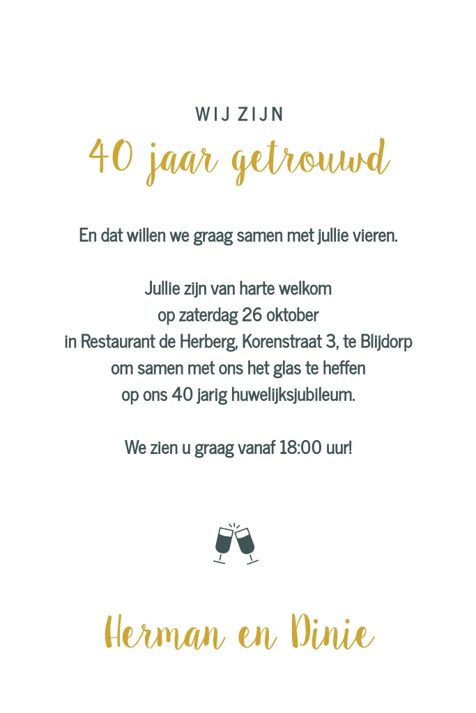 Eenvoudige, maar hippe uitnodiging voor een 40-jarig huwelijksjubileum. Op deze jubileumkaart staat het jaartal van het huwelijk en proostende wijn glazen. Het huwelijksjaar en de tekst veertig zijn natuurlijk aan te passen. Zo is dit kaartje ook geschikt voor andere bruiloftsjaren. Liever andere kleuren? Ook dit is gemakkelijk aan te passen in de editor.