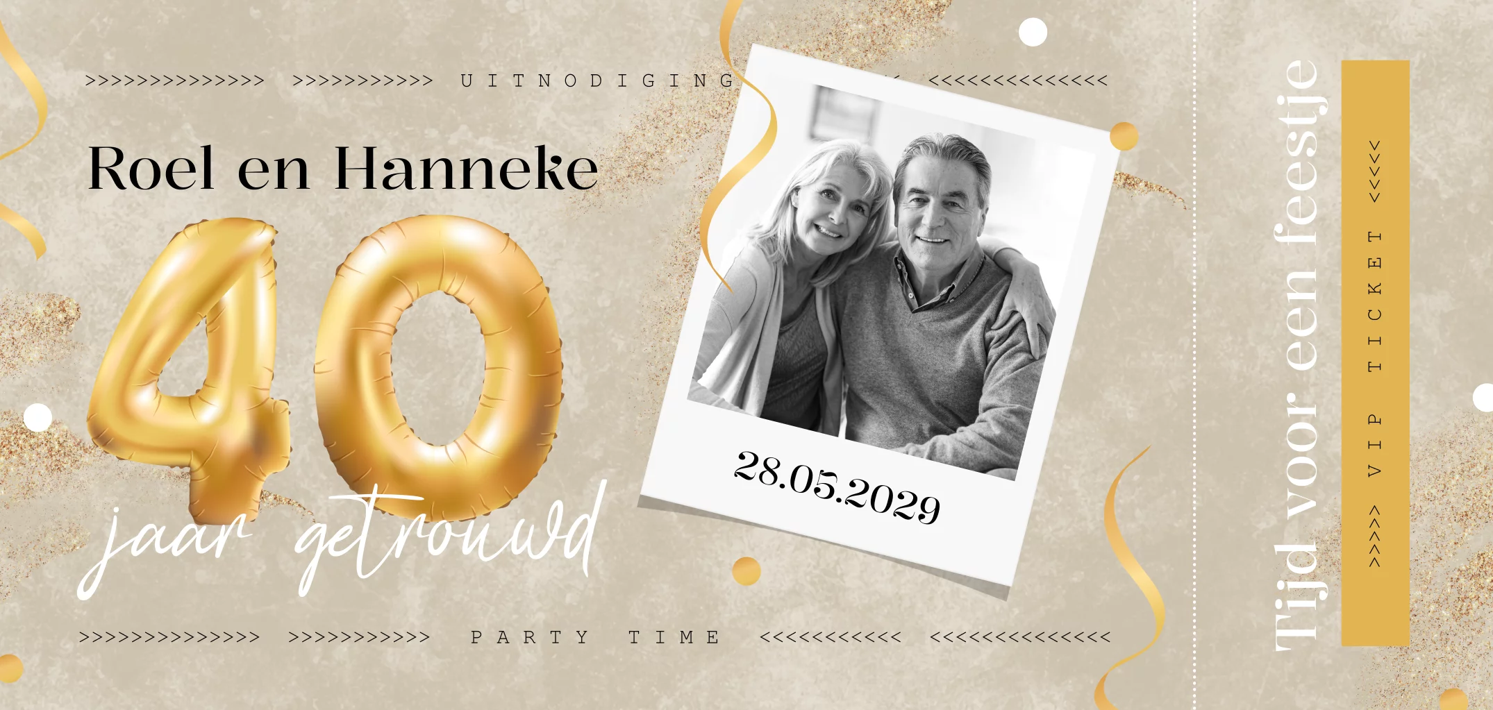 Zijn jullie 40 jaar getrouwd en is het tijd voor een feestje? Nodig je vrienden en familie dan uit met deze hippe en originele ticket uitnodiging. Op deze uitnodiging staat een gouden folieballon in 40 met daaromheen confetti met slingers. Voeg in het fotokader een eigen foto toe en maak deze jubileum uitnodiging zo nog persoonlijker.