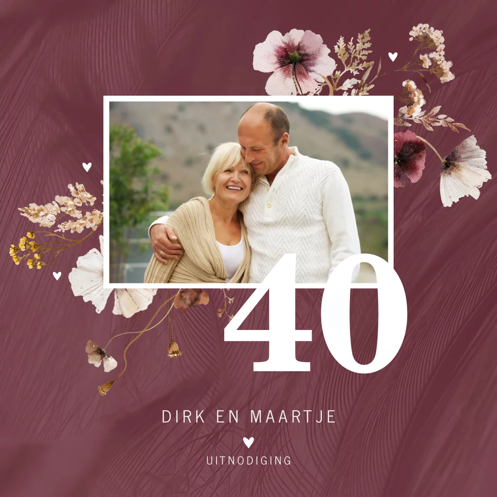 Exclusieve, stijlvolle jubileumkaart voor 40 jaar getrouwd. Op deze uitnodiging staan handgeschilderde bloemen rond een fotokader waarin je eenvoudig een foto kunt plaatsen van jullie als robijnen bruidspaar. Op de bordeauxrode achtergrond veren en het getal '40' wordt in goudfolie gedrukt. De teksten, (folie)kleuren en lettertypes zijn aan te passen in de editor. Zo is deze kaart ook te gebruiken voor andere bruiloftsjaren. Hulp nodig bij het aanpassen van deze uitnodiging? Bel, mail of chat gerust. We staan voor jullie klaar!