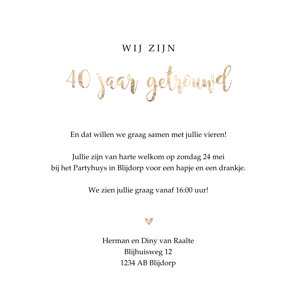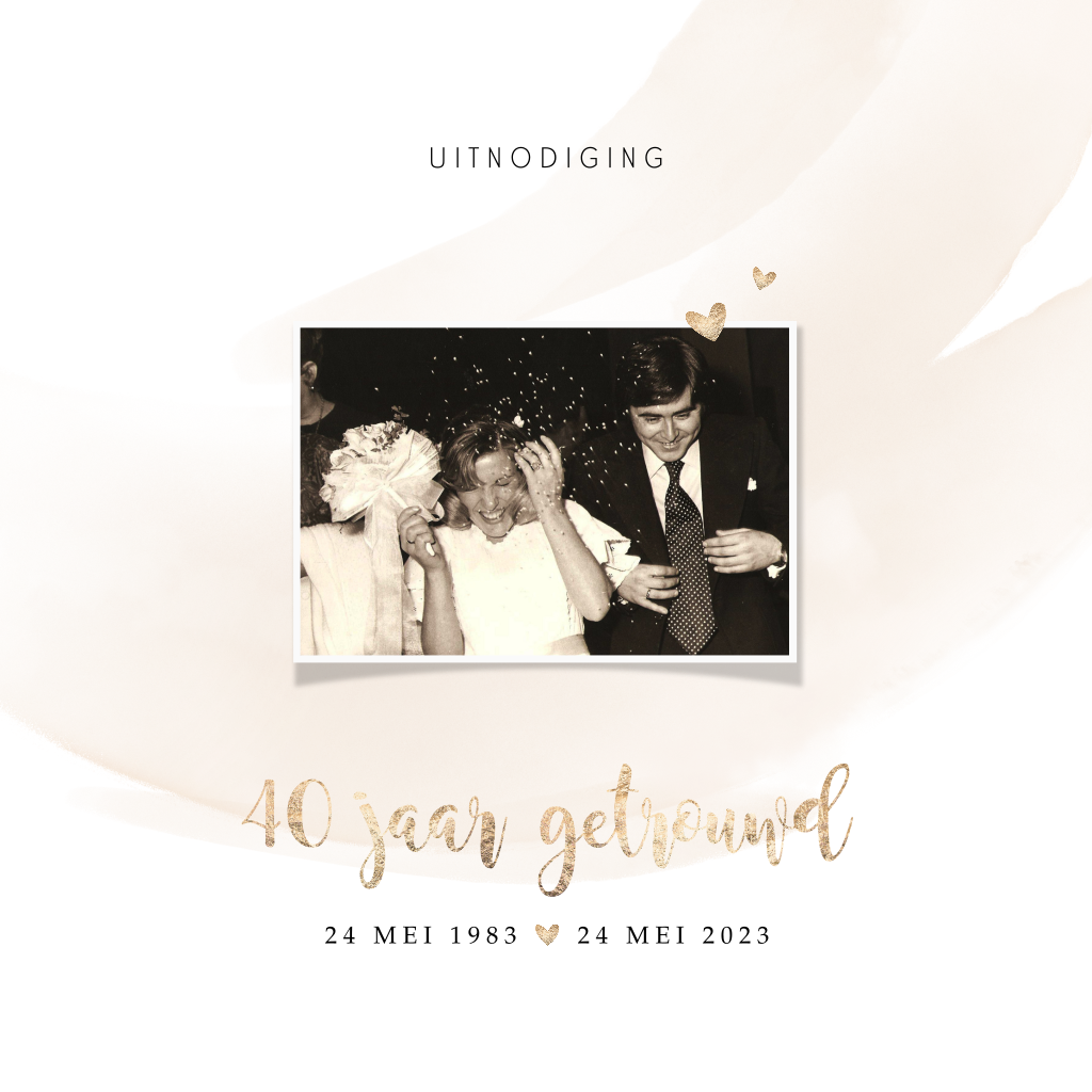 Uitnodiging voor 40 jaar getrouwd. Op deze jubileumkaart plaats je gemakkelijk jullie eigen foto. Achter het fotokader staat een grote aquarel veeg in een zacht roze kleur. De kleuren en teksten zijn aan te passen in de editor.